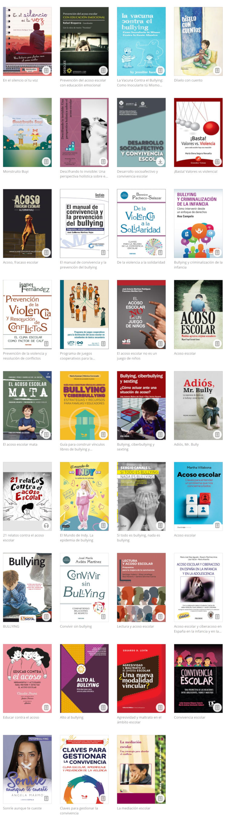 ➤ Prevención del acoso escolar con educación emocional, de Rafael Bisquerra (Desclée de Brower, 2011). Este libro presenta un enfoque desde la educación emocional en el que se proponen actividades para la toma de conciencia del alumnado de la importancia de atender a estos aspectos y ejercicios de regulación de la ira para la prevención de la violencia. Asimismo, se presenta una obra de teatro para ensayar en clase como estrategia para la prevención del acoso escolar y de la violencia en general. Acompañada de una guía didáctica, la obra puede servir de orientación para otras actividades. Además se aportan reflexiones, estrategias, técnicas, actividades y propuestas para la prevención. También se presentan instrumentos de evaluación que permiten conocer la situación en los centros educativos y evaluar cómo puede cambiar a través de la intervención preventiva.