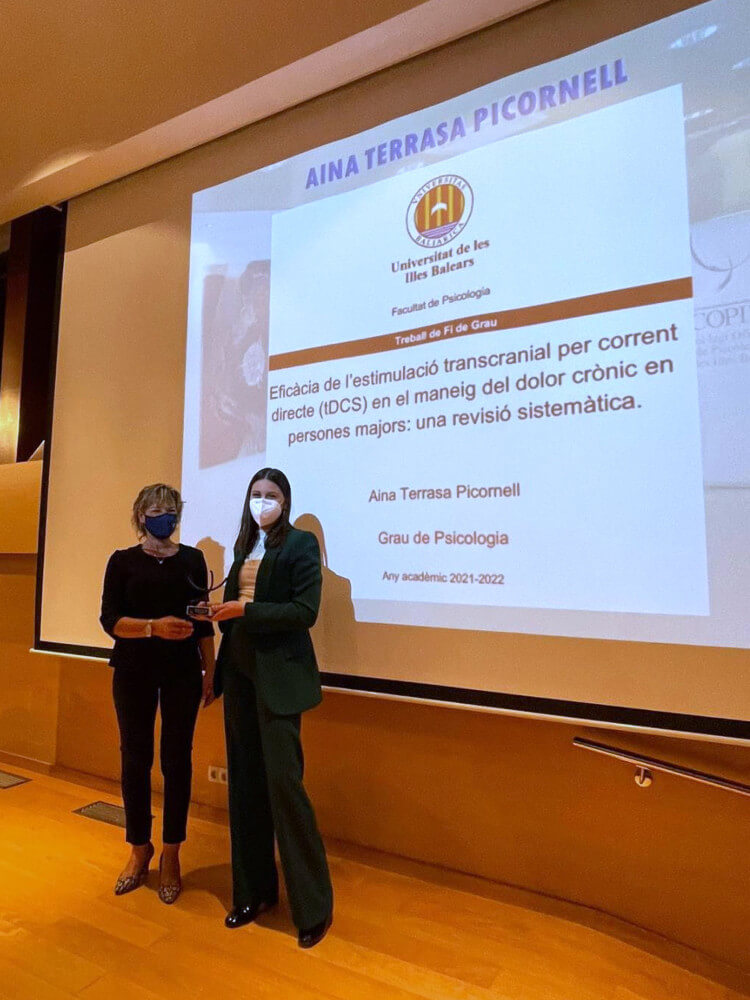 Asimismo, el COPIB otorgó un reconocimiento especial a las autoras de los mejores trabajos de Fin de Grado de Psicología de la UIB y de la UNED, dando valor a la investigación de las nuevas generaciones de psicólogos y de psicólogas “que auguran un futuro prometedor de la profesión”, apuntaba la vicedecana de la Facultad de Psicología de la UIB, Carmen Borràs. En concreto, fueron distinguidas Mar Olivares Cabanellas, alumna de UNED, por su trabajo ‘Imagen corporal como medida de prevención de trastornos de conducta alimentaria en colectivos vulnerables. Propuesta de intervención’, y Aina Terrasa Picornell, alumna de la UIB, por su trabajo ‘Eficacia de la estimulación transcraneal por corriente directa (tDCS) en el manejo del dolor crónico en personas mayores: una revisión sistemática’.
