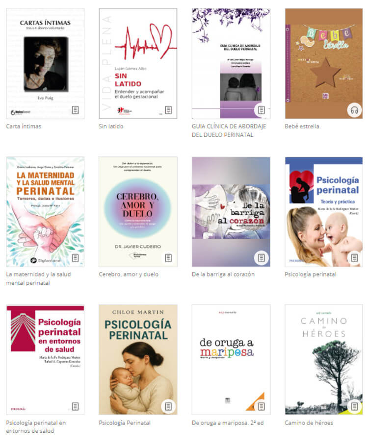 ➤ Guía clínica de abordaje del duelo perinatal, d’AA.VV. (Editorial Bubok Publishing, 2012). Aquest llibre pretén dotar al professional de les habilitats necessàries per a tractar aquest tipus de situacions combinant l’assistència biològica: causes principals de mort perinatal, proves biològiques i elaboració d’un protocol assistencial; amb l’atenció psicològica: coneixements de les habilitats necessàries per a manejar de manera efectiva la situació de mort perinatal disminuint la sensació de solitud experimentada per les famílies, ensenyant-li la comunicació adequada en aquesta mena de processos i capacitar-lo per a controlar la sensació de fracàs, ressentiment o sensació de culpa experimentada pels professionals sanitaris.